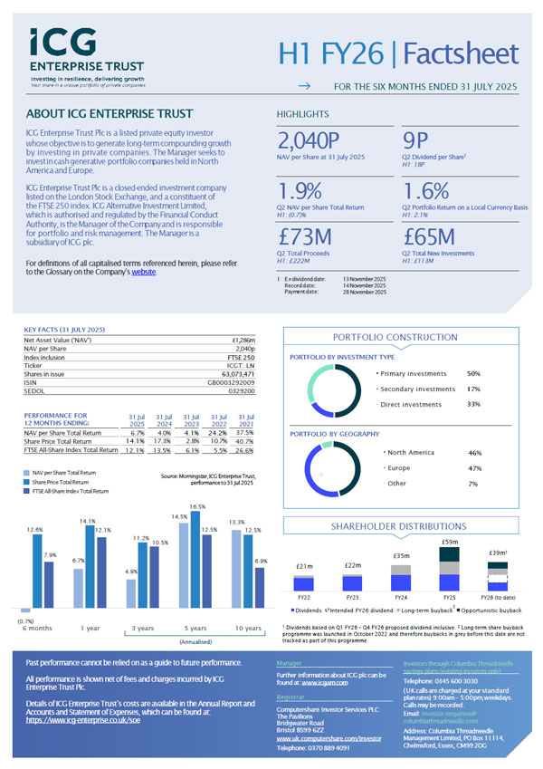 ICG Enterprise Trust is focused exclusively on investing in buyouts in North America and Europe. Through our experience, global network and focus on resilient growth, we seek to deliver attractive long-term returns.